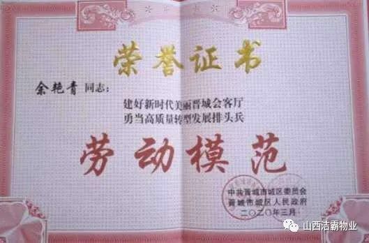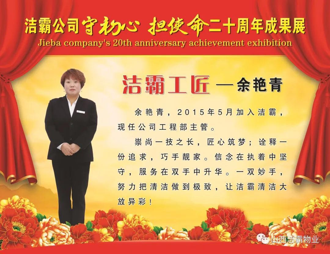 余艷青同志自2015年進(jìn)入潔霸以來(lái),一直奮斗在工程部的第一線從事主管工作。工作中,余艷青同志愛(ài)崗敬業(yè),遵守職業(yè)道德,為人誠(chéng)實(shí)守信;她熱愛(ài)工作,對(duì)待客戶熱情周到、耐心細(xì)致;工作中團(tuán)結(jié)同事,責(zé)任心強(qiáng),吃苦耐勞,服從大局,以公司的利益為重。在我市開(kāi)展的“三洗六見(jiàn)一紅旗”活動(dòng)和全國(guó)文明城市的創(chuàng)建活動(dòng)中,她帶領(lǐng)員工高標(biāo)準(zhǔn)、高質(zhì)量、高效率地完成清洗美化工作,為扮靚晉城形象,打造城市優(yōu)美環(huán)境做出了突出貢獻(xiàn)。先后多次被公司評(píng)為優(yōu)秀員工等,2019年在公司成立20周年慶之際,她又被公司授予“潔霸工匠”稱號(hào)。