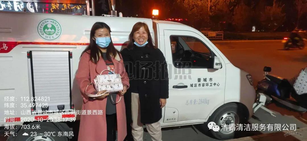 10月20日下午3點左右,晉城市潔霸清潔服務股份有限公司保潔部環(huán)衛(wèi)經(jīng)理李通和工人在城區(qū)南街街道景西路段進行街道清洗作業(yè)時,忽然看見晉城農(nóng)商銀行門前的綠化帶里有一個女士挎包,忙叫環(huán)衛(wèi)工人郭志云把挎包撿了起來。當時就考慮到失主丟失挎包以后一定很著急,在同事的共同見證下他們打開挎包,經(jīng)過查看,發(fā)現(xiàn)挎包內(nèi)有一張王女士的身份證、社保卡及銀行卡數(shù)張,還有結(jié)婚證、鑰匙、耳機、富士康工牌等物品。憑借富士康工牌上的工號,他們給富士康打電話聯(lián)系到了失主,后由環(huán)衛(wèi)主管秦彩鳳將挎包交到失主手中。收到失而復得的挎包,王女士又驚又喜,感激萬分。