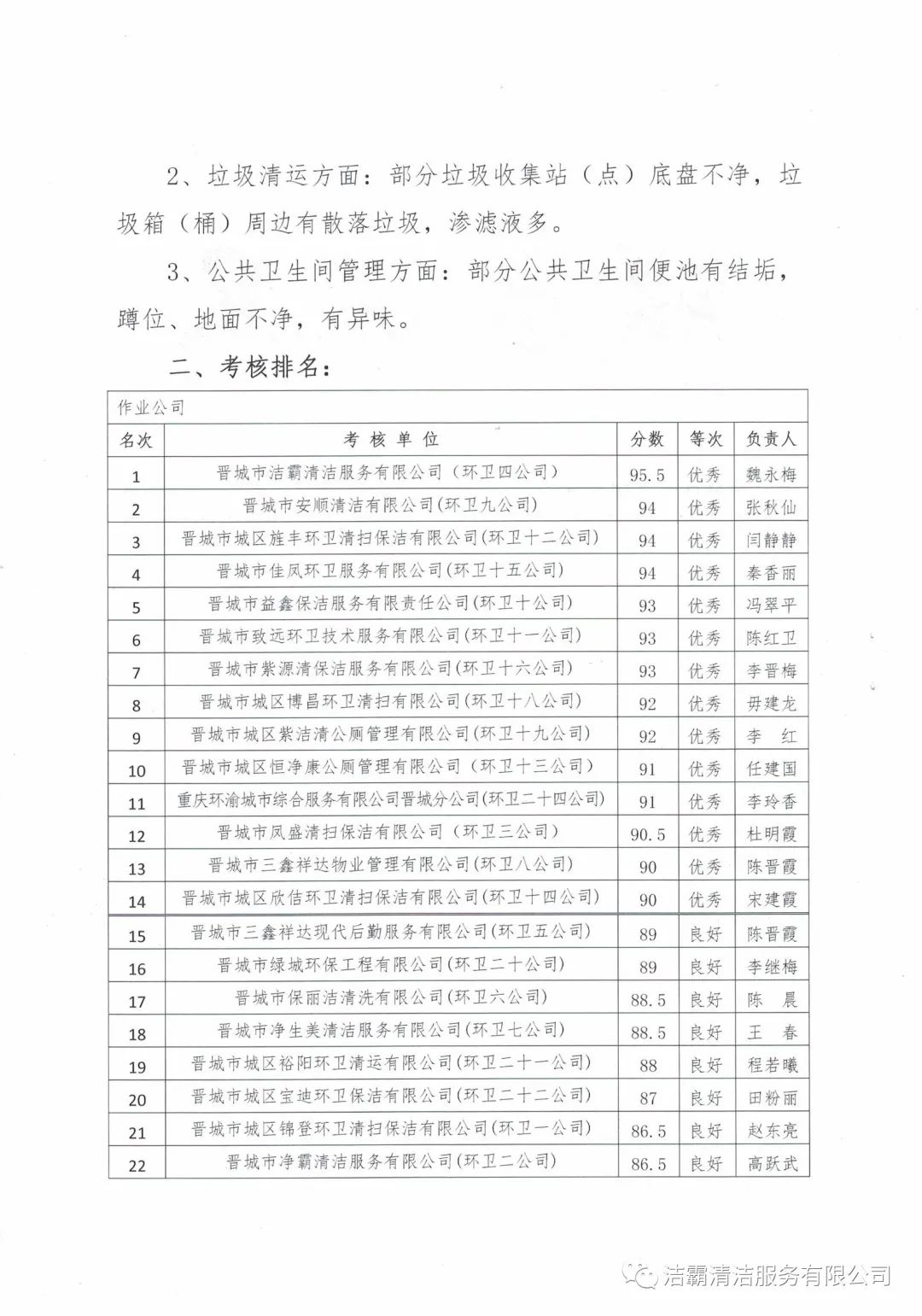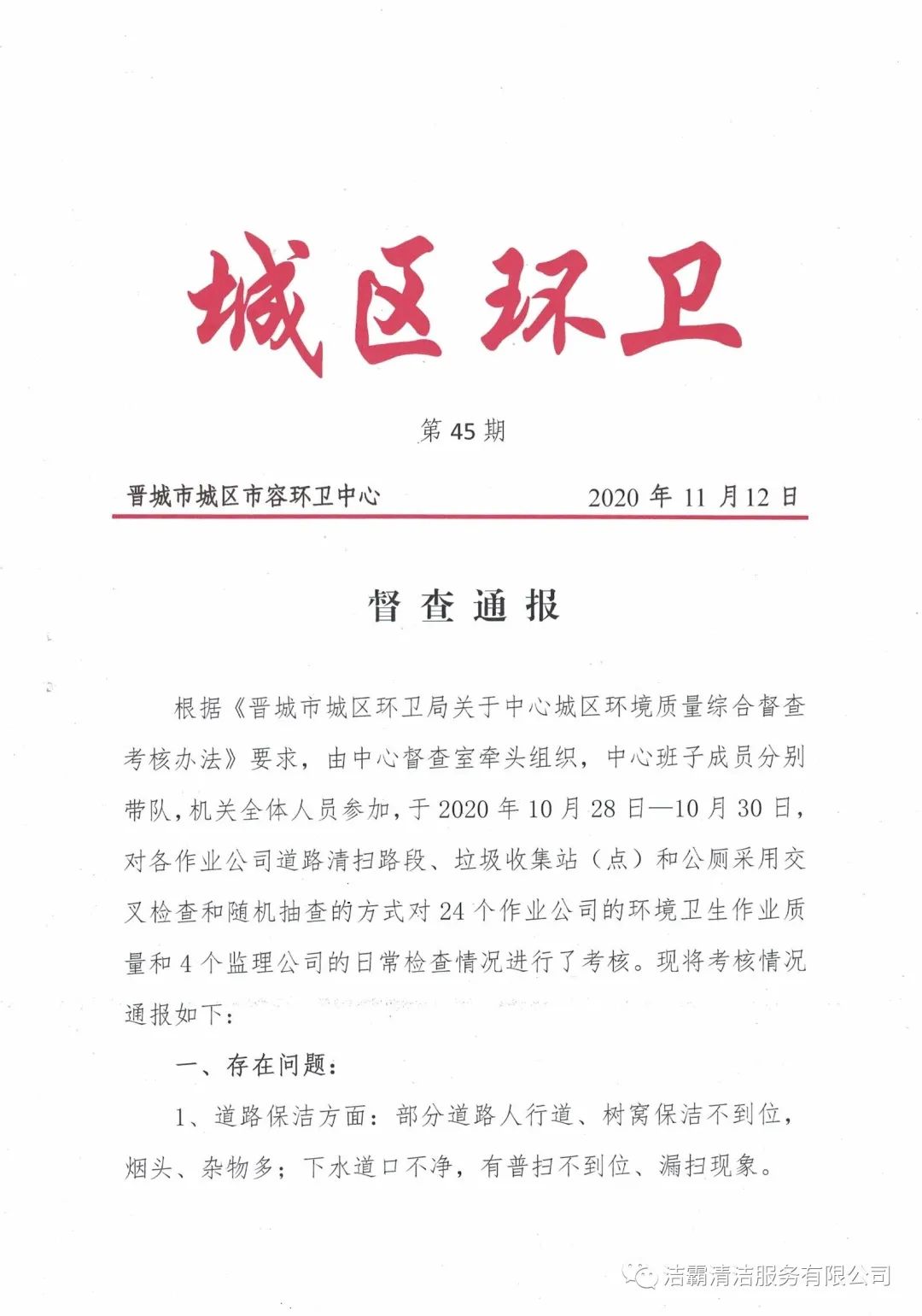 2020年10月28日—10月30日,晉城市城區(qū)市容環(huán)衛(wèi)中心由中心督查室牽頭組織,中心班子成員分別帶隊,機關全體人員參加,對各作業(yè)公司道路清掃路段、垃圾收集站(點)和公廁采用交叉檢查和隨機抽查的方式對24個作業(yè)公司的環(huán)境衛(wèi)生作業(yè)質量和4個監(jiān)理公司的日常檢查情況進行了考核。晉城市潔霸清潔服務股份有限公司所屬的環(huán)衛(wèi)四公司分數(shù)最高,名列第一。