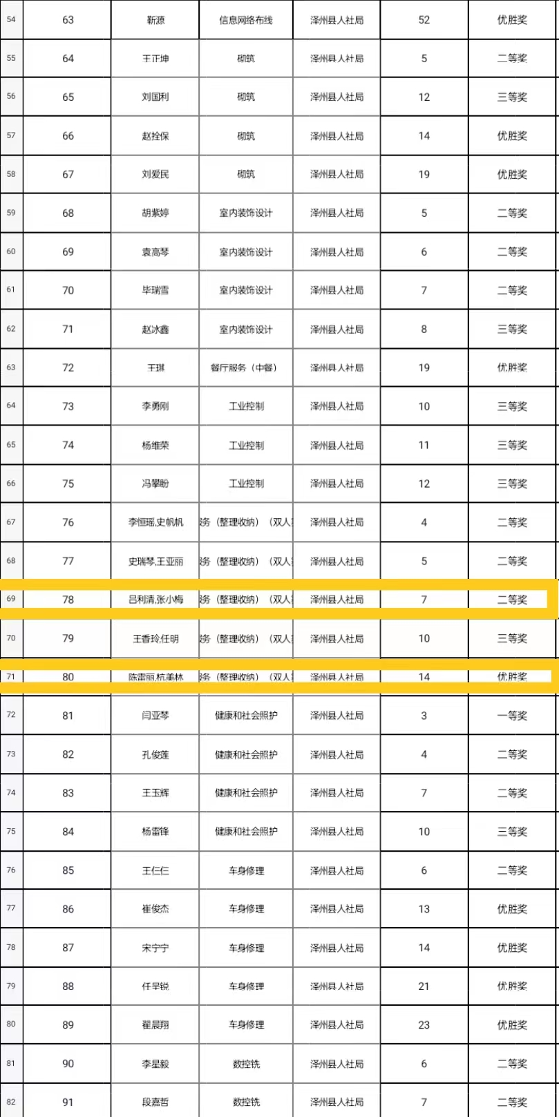 近日,從澤州縣人社局傳來(lái)好消息,公司呂利清、張小梅在第三屆晉城職業(yè)技能大賽家政服務(wù)(整理收納)項(xiàng)目(雙人賽)中榮獲二等獎(jiǎng),陳雷麗、杭美林在同項(xiàng)目中榮獲優(yōu)勝獎(jiǎng)。