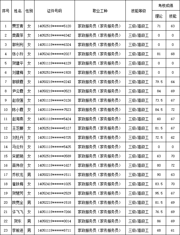 山西潔霸清潔服務(wù)集團(tuán)股份有限公司職業(yè)技能等級認(rèn)定中心2025年8月30日第1批家政服務(wù)員(家務(wù)服務(wù)員)高級認(rèn)定人員成績公示